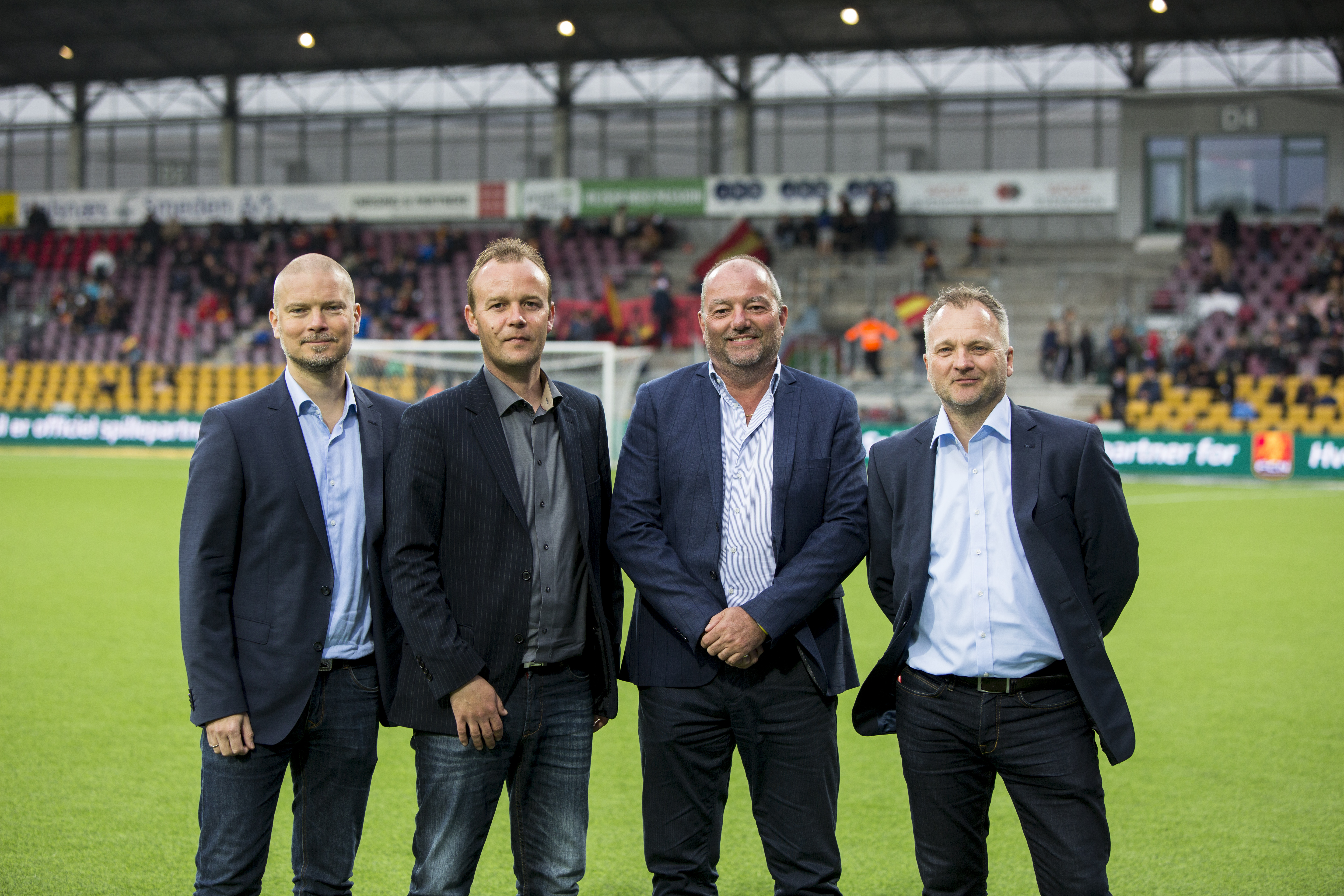 Samarbejdsaftalen mellem Stenløse Boldklub og FCN blev underskrevet i forbindelse med sidste uges Superligakamp i Right to Dream Park, hvor repræsentanter for de to klubber her er fotograferet på banen i pausen. Fra venstre Thomas Heede Arndt, FCN, Lars Stage, formand SB, Kim Madsen, bestyrelsesmedlem SB og Jens Andersen, FCN.(Foto: Rie Neuchs)